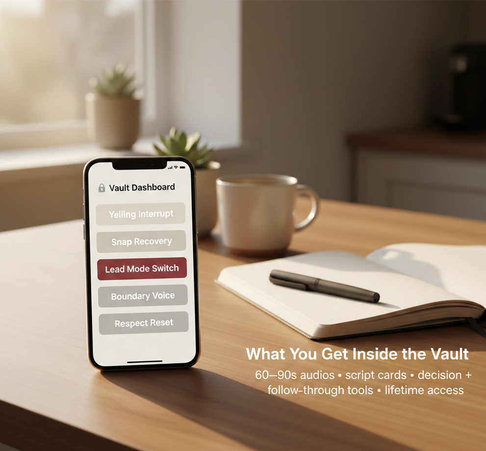 If you’ve ever Googled “how to stop yelling at my kids”… this is for you. You’re not broken. You’re overloaded. And when disrespect hits, your nervous system takes the wheel. This Vault gives you a place to go before you snap—so you can interrupt yelling, reset after reacting, and lead your home differently… even on hard days. You don’t have to “finish” this. You use it. Start with the Dashboard. Tap the tool. Repeat.