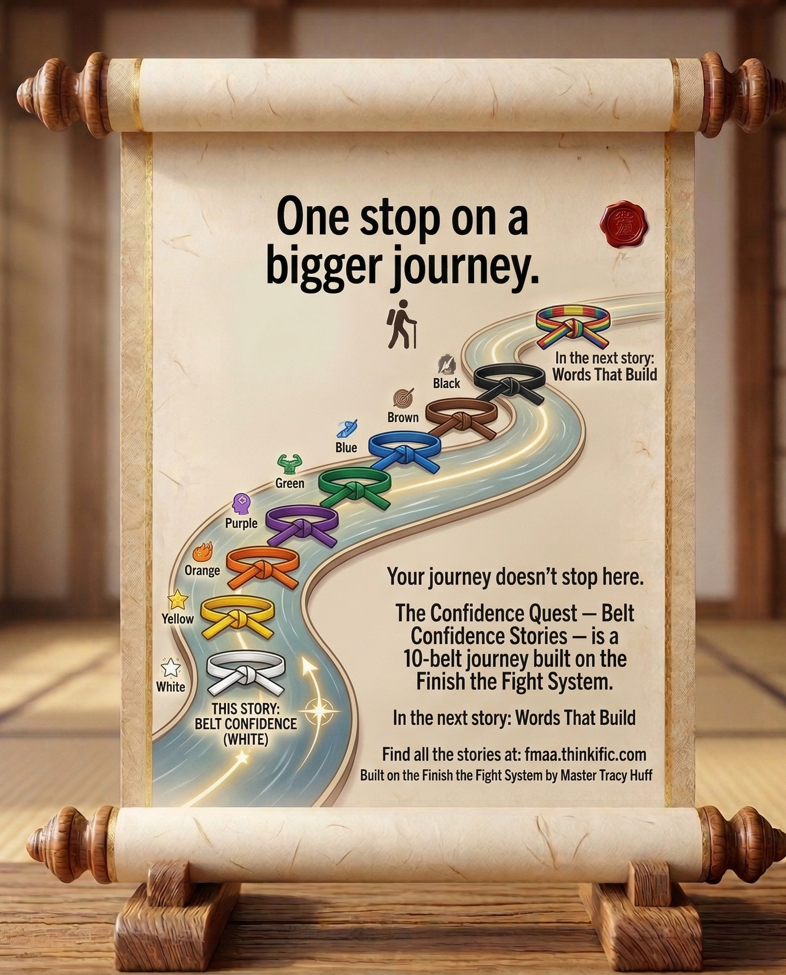 This is the first stop on a bigger journey. After White Belt, families can continue with The Confidence Quest, featuring Belt Confidence Stories — a full story-based leadership journey for martial arts kids.